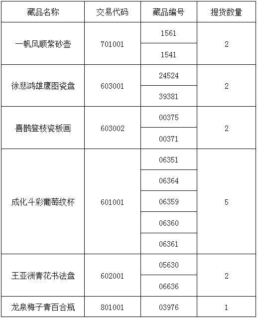 應投資人會員申請,經本交易所對申請人信息核實以及出庫藏品復驗后,提貨藏品已完成發貨,提醒廣大投資者注意盤面藏品數量變化。提貨藏品信息如下: